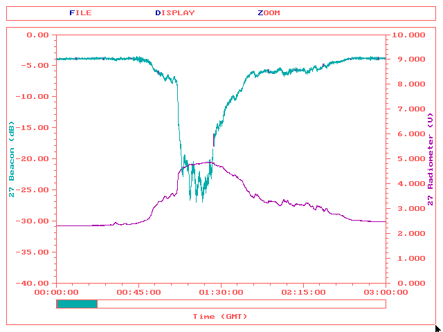 The New Mexico ACTS Propagation Terminal (APT) team collecting data at the TDRS ground terminal. The team used the standard 1-meter Ka Band dish. The NMSU personnel collected the data, performed the initial processing, and calibrated the equipment. The propagation measurements determined the depth of rain fades with the rain rate and the associated increase in the sky temperature.